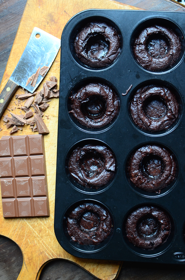 So basically what you do is just bake a bunch of brownies in a muffin tin. Don’t use paper liners. The brownies will just stick to them (a mistake I made on round two).